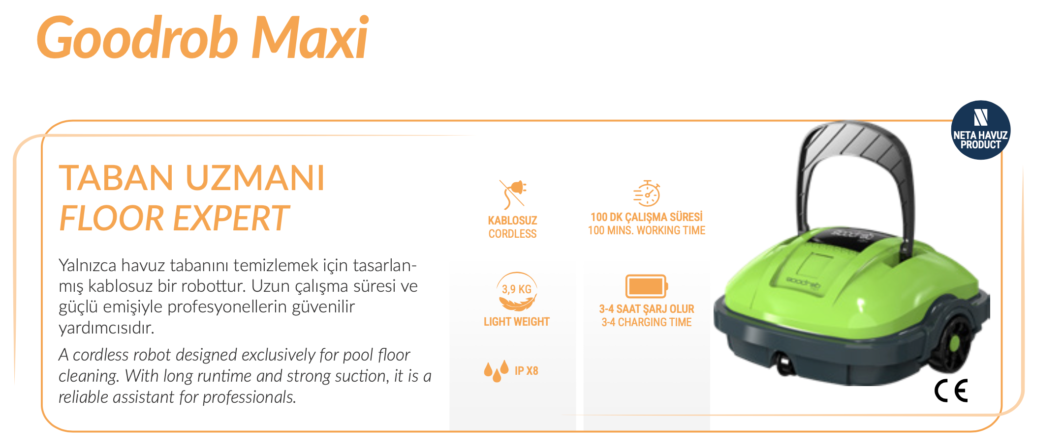 Pratik ve zahmetsiz havuz tabanı temizliği arayışındaysanız Goodrob Maxi tam da aradığınız ürün. 80 m2 ye kadar olan havuzlar için uygundur.